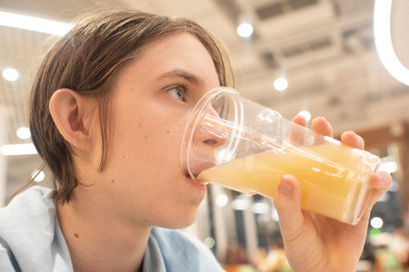 A teenage boy drinks juice at a food court.