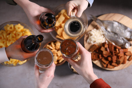 Friends clinking glasses of beer at gray table, top view