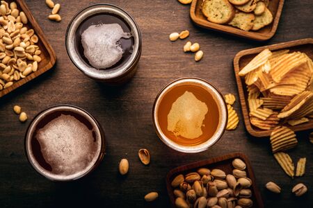 Craft beer in pub. Different types of drink, chips, croutons and nuts in plates and scattered on table, top view