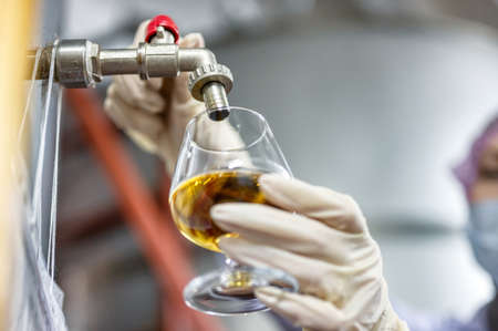 Woman holds glass of alcohol drink under tap in workshop
