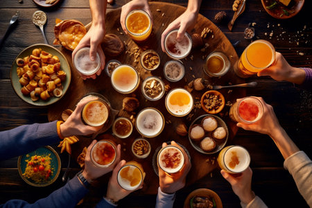 Aerial view of group of people, friends clink large, frothy beer mugs together in celebratory toast at bar.