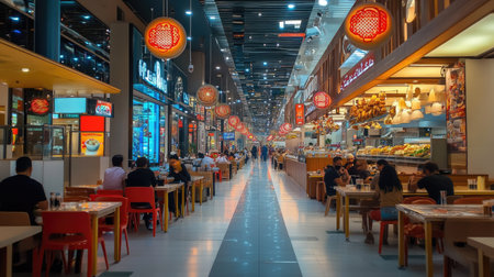 A vibrant food court filled with diverse dining options and illuminated lanterns. Guests enjoy their meals in a lively setting, perfect for socializing.