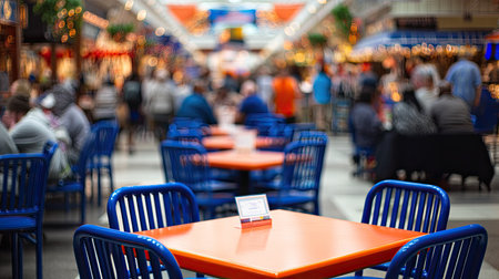 Outdoor dining area with orange tables and blue chairs in a large indoor market setting. The background is filled with blurred figures of people eating and shopping.
