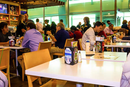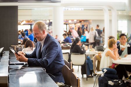 Miami, Florida, USA - December 12, 2019: Travelers inside cafe at Miami International Airport in Miami FL. The airport ranks first in the United States by percentage of international flights.