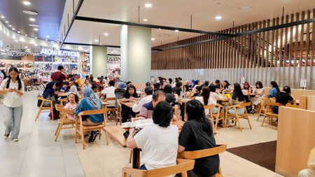 photo of people eating and socializing at a busy modern food court cafeteria inside IKEA and AEON Mall. Bandung 8 July 2025