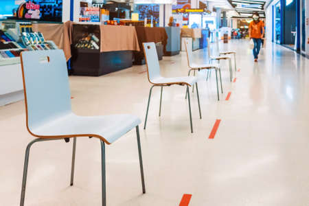 KANCHANABURI THAILAND-MAY 13,2020: Spacing chairs zone to sit and wait for transactions with the bank during the spread of the Corona virus(Covid-19) in front of the bank at Robinson department store.