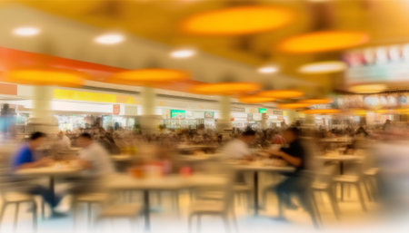 blurry defocused image of people eating food in food court for background
