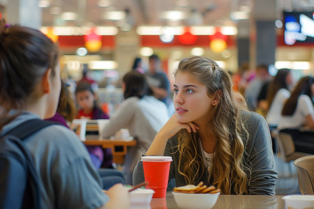 Teens at food court at shopping mall. Girls resting after work day together. Generative AI