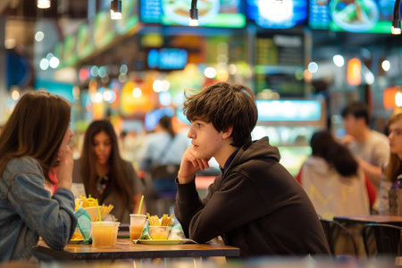 Teen boy at food court at shopping mall. Attractive pensive teenager eating lunch. Generative AI