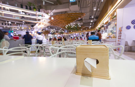Wooden tissue box on a table inside food cause in a shopping mall at Bangna-Trad Road Bangkok Thailand