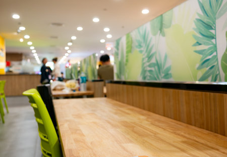 table and chair in food court canteen restaurant interior. defocused blur background