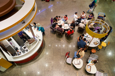 SINGAPORE - JAN 16, 2017 : People at popular food hall in Singapore. Inexpensive food stalls are numerous in the city so most Singaporeans dine out at least once a day.