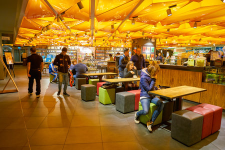 Interior and people in dining room in cafe of the huge IKEA store.