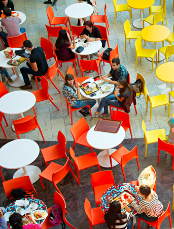 UAE, DUBAI - DECEMBER 25: people in a cafe in Dubai Mall shopping center on December 25, 2014. Top view