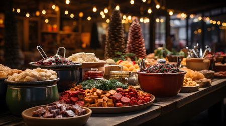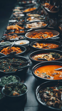Cultural feast featuring diverse dishes and vibrant decorations at a local market.