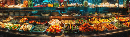 A Panoramic view showcasing a wide array of international cuisine in a vibrant, colorful display.