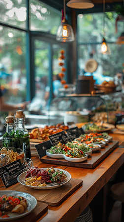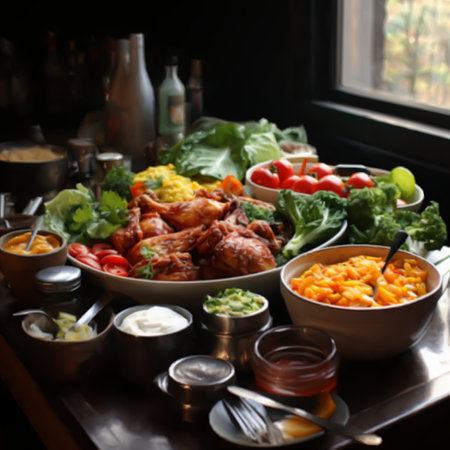 Gourmet Buffet Spread with Fresh Salads, Grilled Vegetables, and Delicious Appetizers in Rustic Kitchen.