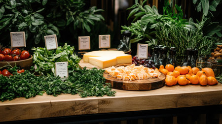 Artisan cheese and charcuterie board on a food display table surrounded by herbs and labels