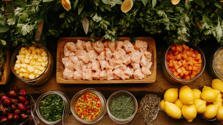 A vibrant display of fresh ingredients including diced chicken, colorful vegetables, and herbs arranged on a rustic wooden table, perfect for preparing healthy meals.