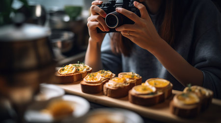 Food content creator blogger camera phone blog social media, producing and sharing content related to food channels online outlets vlogging culinary meal cooking