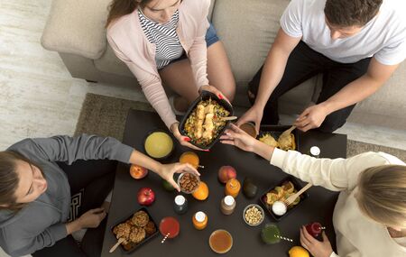 Healthy nutrition concept. Friends eating healthy grilled food to go at home and drinking detox smoothie