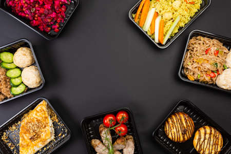 Ready healthy food catering menu in lunch boxes meat and vegetable packages on black table background
