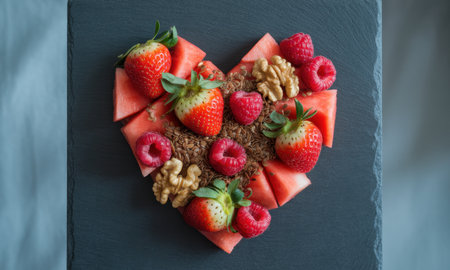 Heart shaped arrangement of fresh strawberries, raspberries, watermelon slices, walnuts, and flax seeds on a dark slate. symbolizes healthy eating, love, and wellness.