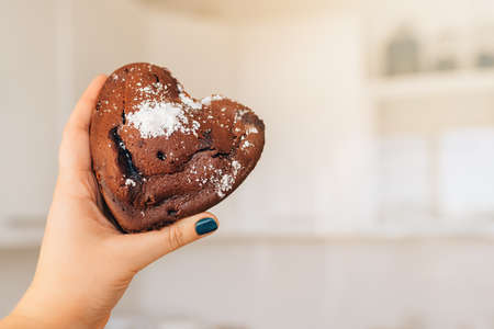 Woman in red shirt holds heart cake in hands, Symbol of love giving