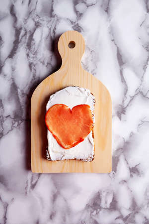 Top view of toast with cheese spread on cutting board and heart shaped loin and marble background