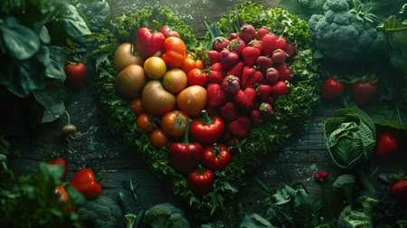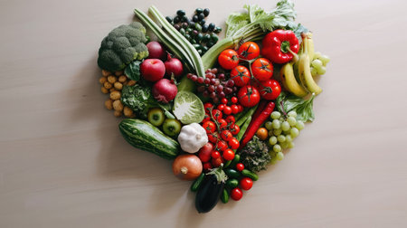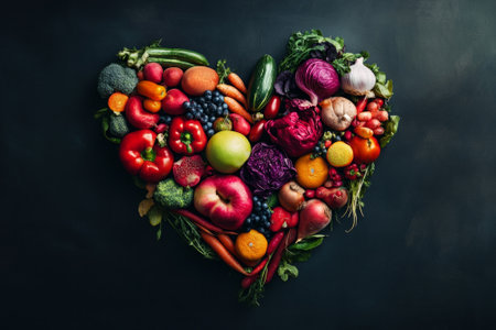 Heart shape created with fresh fruits vegetables and fish highlights a vibrant healthy eating lifestyle and nutrition focus for wellness enthusiasts