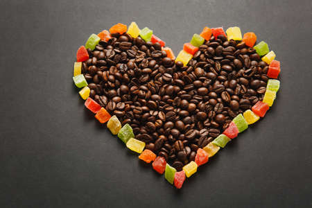 Colorful candied fruits in the form of heart with brown coffee beans isolated on black background for design. Saint Valentine's Day card on fabruary 14, holiday concept. Copy space for advertisement