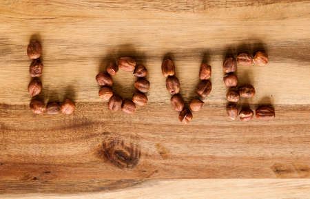 Love written out with hazelnuts on wooden background.