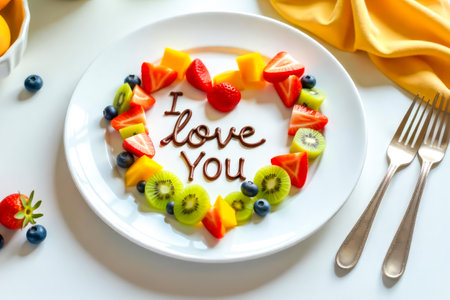 Colorful heart-shaped fruit arrangement with “I love you†written