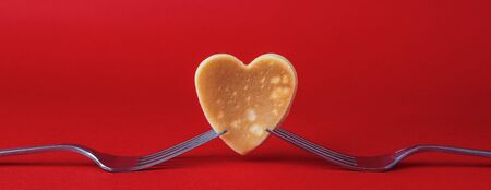 Creative breakfast for Valentine's Day. A pancake in the form of a heart is held in two forks, on a red background.Valentine's day background. Copy space
