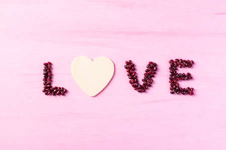 Love made from azuki bean seeds with heart shape on pink background, Valentine day concept