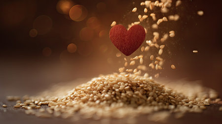 This captivating image features a heart symbol gracefully suspended above a mound of sesame seeds, bathed in warm, glowing light, evoking feelings of love and nourishment.