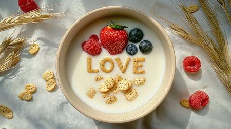 A delightful breakfast bowl featuring fresh fruits, cereal, and a playful love message, creating a warm and inviting morning scene ideal for food enthusiasts.