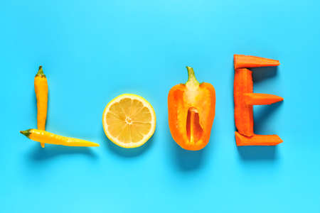 Word LOVE made of fresh vegetables and lemon on color background