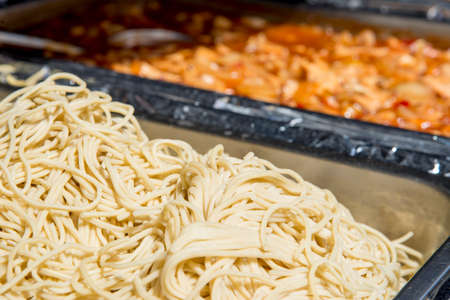Top view of boiled spaghetti pasta in plastic box on wooden table. Cooking at home. Start and promote your food business.