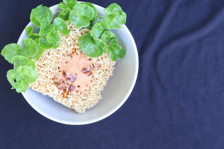 Raw instant noodles with vegetables in the bowl isolated on black cloth background closeup.