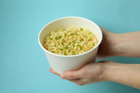 Instant noodles composition. Noodles and fresh vegetables and spices on bright blue background