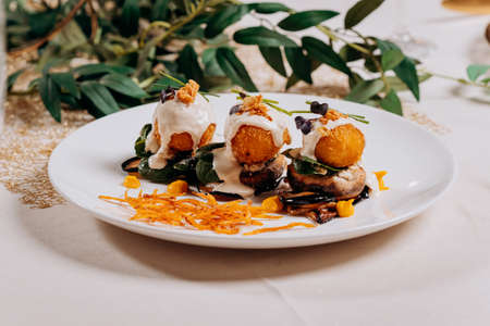 Fried cheese balls are served on a pillow of mushrooms and eggplant ready for eat. Restaurant menu