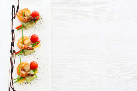 Top view on plate with fried prawns with vegetables on white wooden background, free space for advertisement. Vertical orientation of shrimp meal