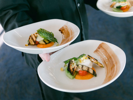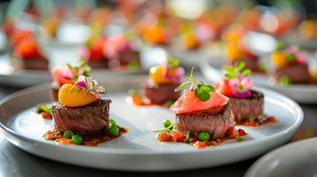 gourmet catering services, elegantly crafted gourmet dishes by top chefs for a high-end event catering menu highlighting culinary skill and innovation