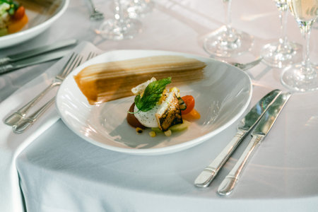 Elegant luxury dining with gourmet cuisine and wine in a cozy restaurant. Culinary delight captured in ambient lighting. Food catering and English cuisine