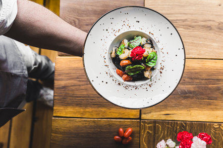 Chef holding a plate of fresh salad with beef meat and vegetables