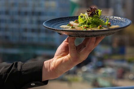 Hot dish with meat and vegetables in a white plate. The waiter carries the dish in the restaurant.