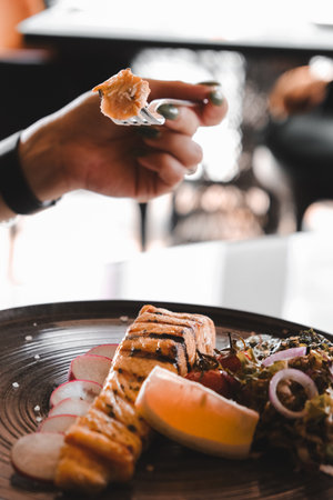 There is a salad close-up. hands properly hold cutlery in the restaurant. table etiquette.