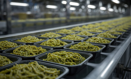 This image captures a conveyor belt loaded with packaged food containers, highlighting the modern food processing industry and its commitment to efficiency and quality.