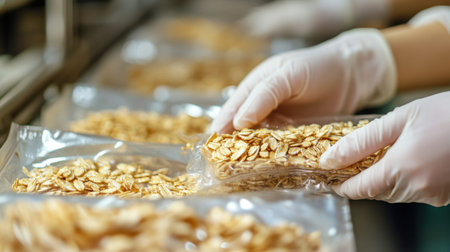 The image shows a person in white gloves carefully packing oats into transparent bags, highlighting food safety and hygiene in a production environment.